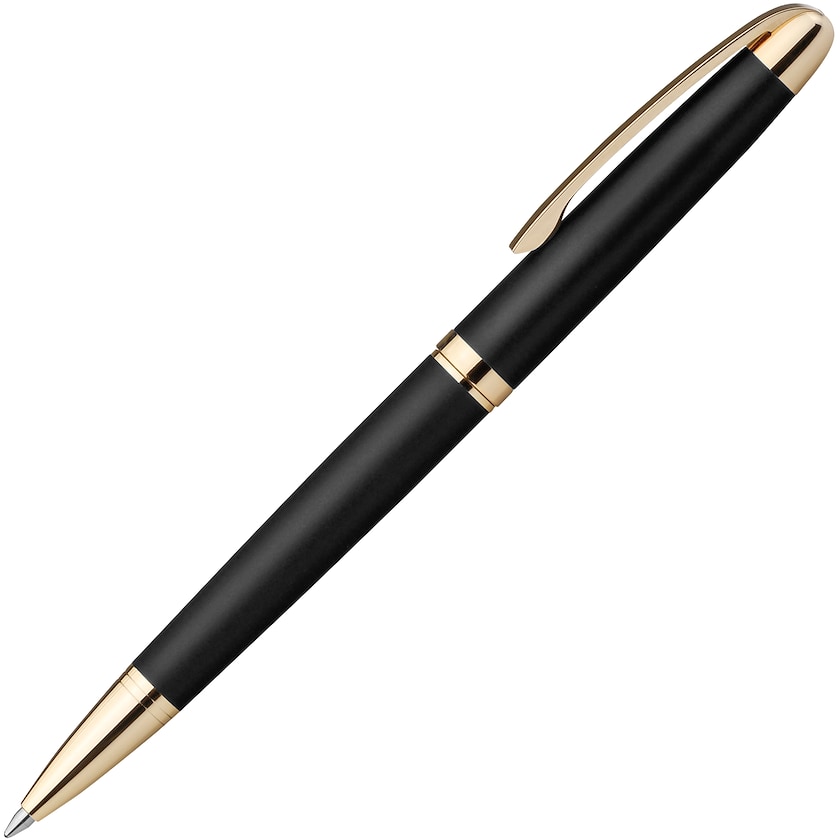 Metallspenne med detaljer i gullfinish. Pennen har vrimekanisme og blått blekk. Leveres enkeltpakket i en svart pappeske.