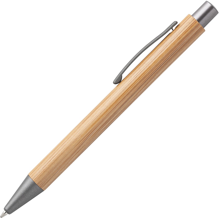Elegant penn av bambus og metall. Blekkpatronen har blått blekk.