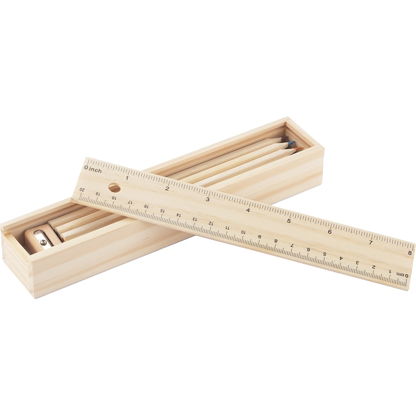 Sett med 12 stk fargeblyanter, linjal og viskelær. Merkingen skjer på linjalen.