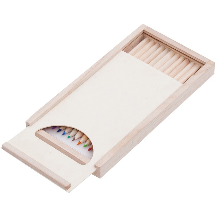Sett med 12 fargeblyanter og 6 ark med forhåndstrykte motiv. Settet leveres i en trivelig treboks. Merking skjer på boksen.
