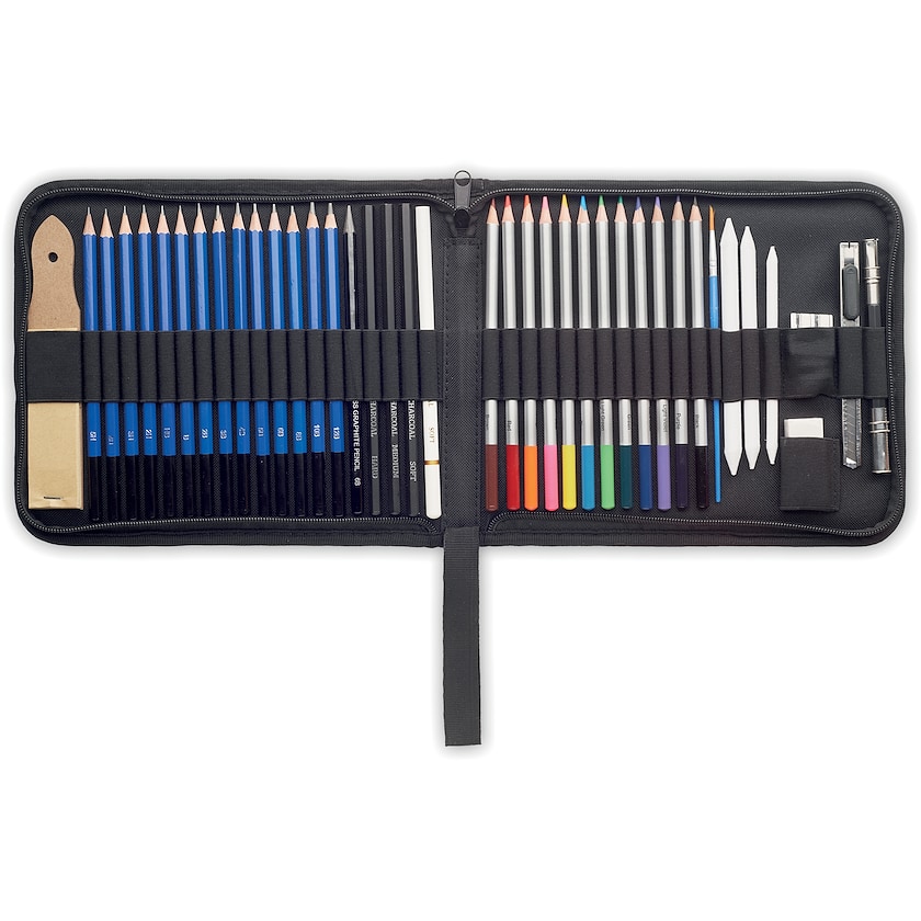 Påkostet skisse- og tegnesett. Settet levres i et futteral med glidelåslukking av miljøvennlig RPET. Inneholder alt til den vordende kunstneren.