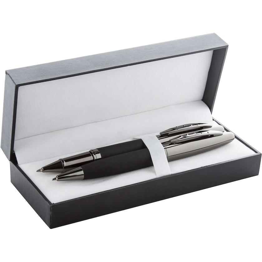 Moderne pennesett med blekkpenn og kulepenn. Metallpennene har gummiert grepoverflate og metalloverflater i gunmetal-farge. Pennene har blått blekk. Merking skjer enten med trykk eller lasergravering. Merkingsprisen er for merking av en av pennene.