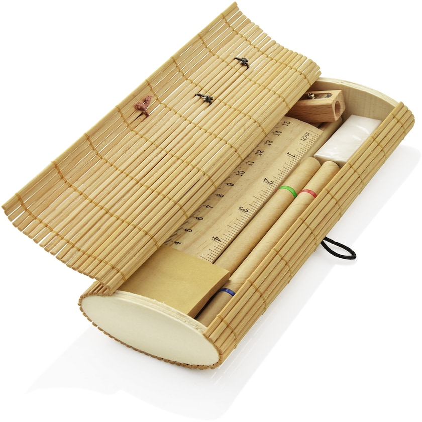 Trivelig pennesett av bambus. Pennesettet inneholder to blekkpenner med rødt, blått, svart og grønt blekk, to blyanter, viskelær, blyantspisser og linjal i tre. Merking skjer med lasergravering på en trebrikke som finnes på selve pennalet.