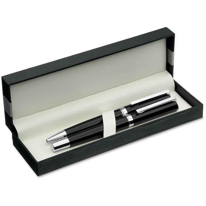 Sort pennesett i pen gaveeske. Settet består av en kulepenn og en blekkpenn. Trykk kan skje i maksimalt en farge.
