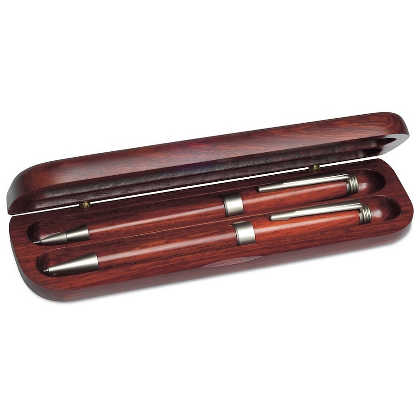 Eksklusiv pennesett med penner og eske i tre. Settet inneholder en kulepenn og en stiftpenn.