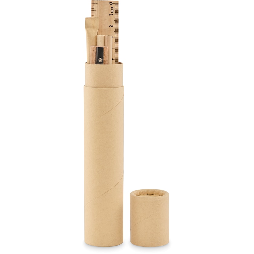 Pennesett i naturfarget papprør. Settet inneholder 2 blyanter, 1 kulepenn, 1 blyantspisser og et viskelær. Trykket gjøres på papprøret.