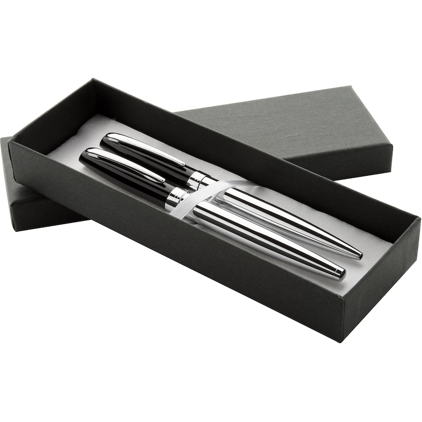 Vakkert pennesett som består av en kulepenn og en fyllepenn. Pennene har forkrommede detaljer og blått blekk. Leveres i en svart gaveeske.