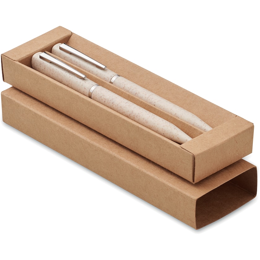 Miljøvennlig pennesett i en naturfarget pappeske. Inneholder kulepenn med blått blekk og en grafittpenn med evighetsskrift. Pennene er laget av miljøvennlig hvetehalm. Pappesken er laget av resirkulert papir.