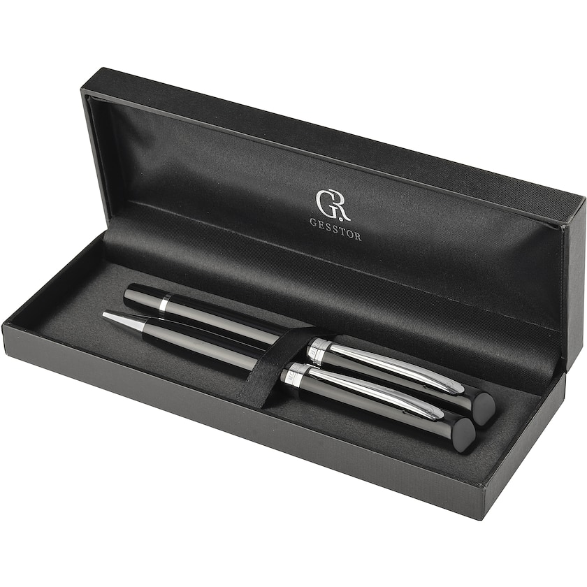Klassisk designet pennesett. Settet inneholder en kulepenn og en blekkpenn av metall. Begge pennene har sort blekk. Lasergraveringsprisen er for merking på en av pennene.