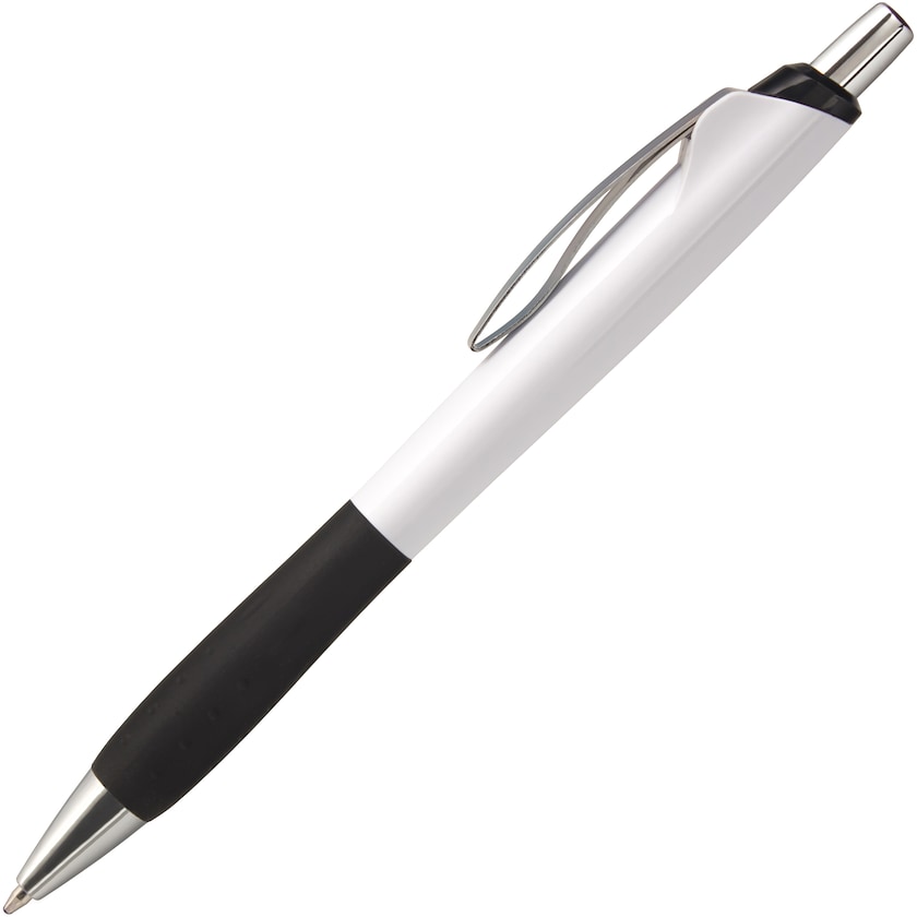 Hvit penn med stort, behagelig grep. Takket være de forkrommede detaljene, virker pennen dyrere enn den er i virkeligheten. En penn som kombinerer funksjon og design på en ypperlig måte.