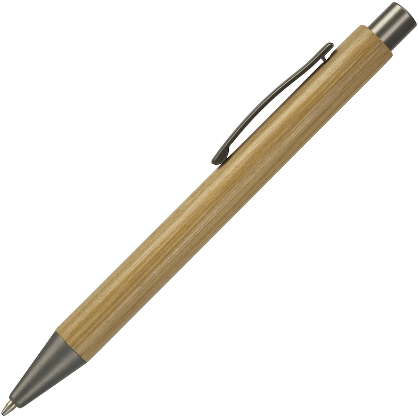 Penn av bambus med metallklips. Detaljene er lakkert i en mørkegrå metallic farge. Pennen er et godt miljøvalg siden bambus er et miljøvennlig materiale som dyrkes klimaeffektivt.