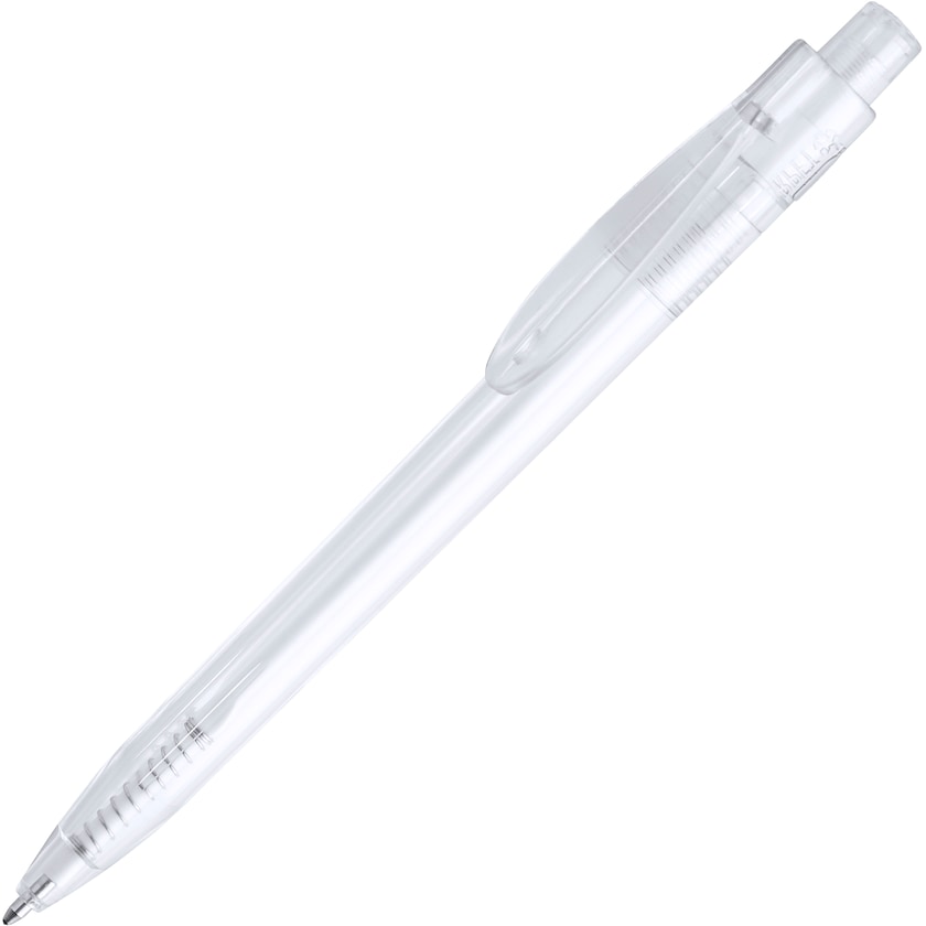 Rimelig reklamepenn av miljøvennlig RPET. Pennen har blått blekk. RPET er produsert av resirkulerte PET-flasker.