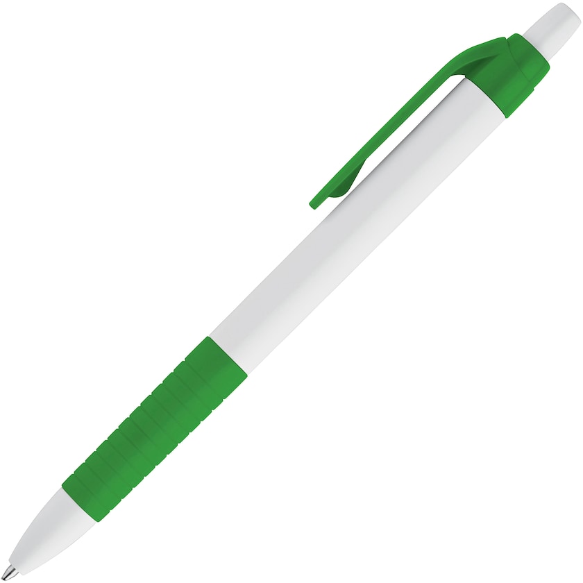 Reklamepenn med hvit pennekropp og kontrastfargede detaljer. Pennen har et godt gummigrep og klips i matchende farge.