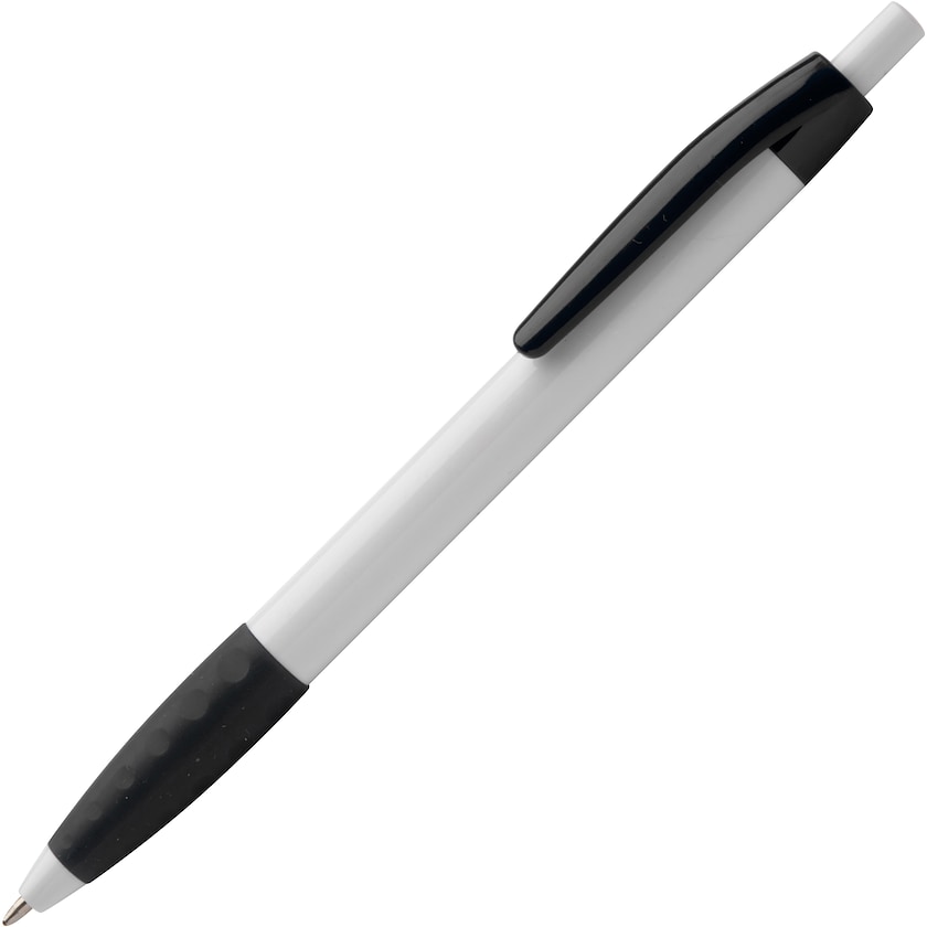 Hvit reklamepenn med skjønt gummigrep. Pennen har kontrastfarget klips og grep. Finnes i flere attraktive farger.