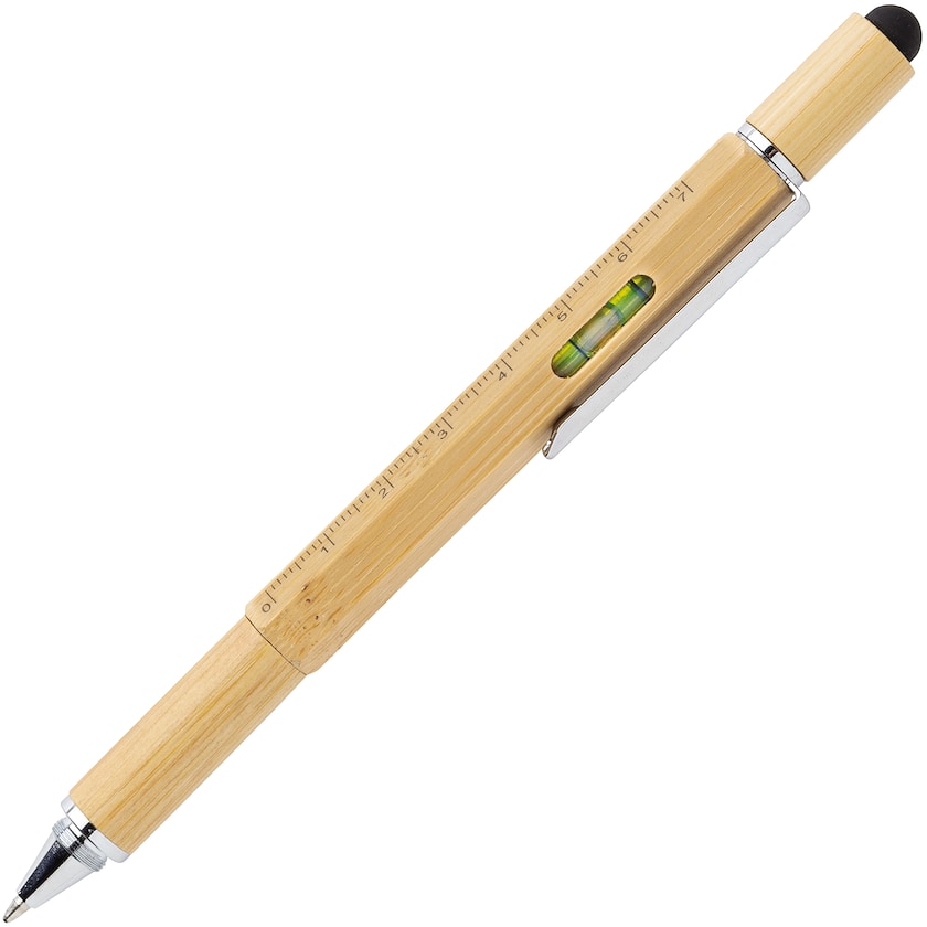 Verktøypenn av bambus med flere funksjoner. Inneholder en linjal på 7 cm, vater, skrujern, touchfunksjon og kulepenn med blått blekk. Leveres i en stilig gaveeske. Handymannens beste venn!