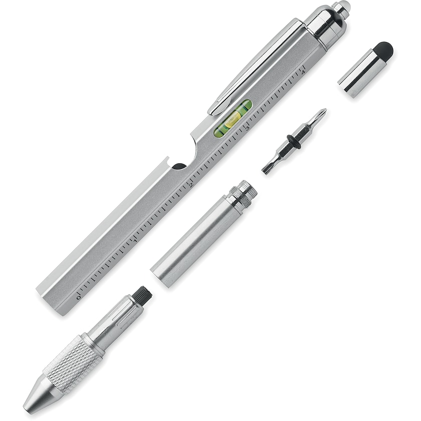 Penn av rustfritt stål med flere smarte funksjoner. Foruten penn, inneholder Catlin også linjal, vater, bits til skrutrekker med stjerne- og flattspor, samt lampe. 3 stk AG-batterier inkludert.