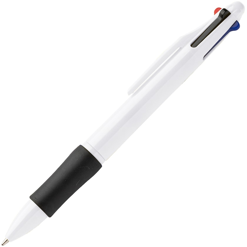 Penn med svart, blått, rødt og grønt blekk. Multipennen Keith, har et gummigrep som gjør at den er behagelig å skrive med. Laget av resirkulert ABS.