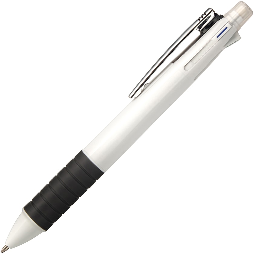 Flerfunksjonspenn med fire ulike blekkfarger samt blyant. Blekkfargene er blå, svart, rød og grønn. Blyantblyet er 0,5 mm tykt. Blyanten kan etterfylles med behov. På toppen finnes viskelær.