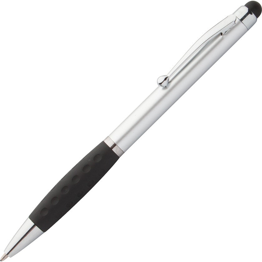 Touchpenn med grep. Pennen har stilige forkrommede detaljer og blå blekkpatron.