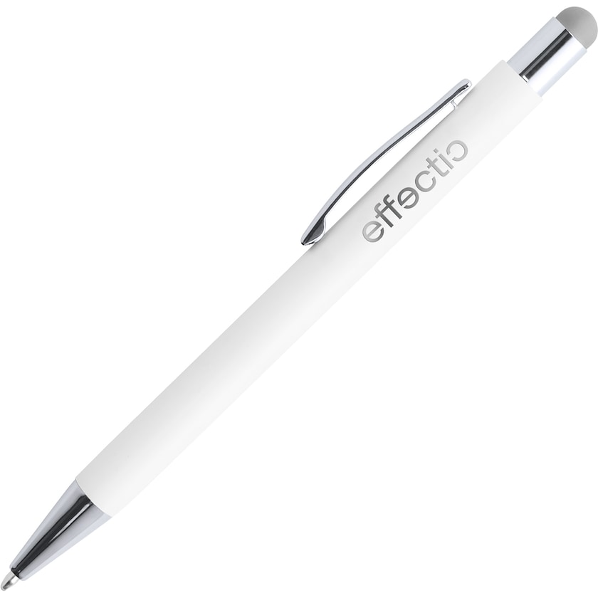 Hvit touchpenn med lasergravering som vises i farger. Når pennen lasergraveres vises motivet i samme farge som touch-enden av pennen. Pennen er laget av aluminium og har blå blekkpatron.