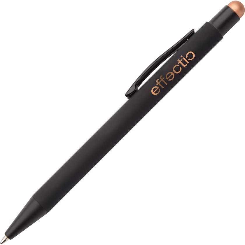 Svart touchpenn med lasergravering som vises i farger. Når pennen lasergraveres vises motivet i samme farge som touch-enden av pennen. Pennen er laget av aluminium og har blått blekk.
