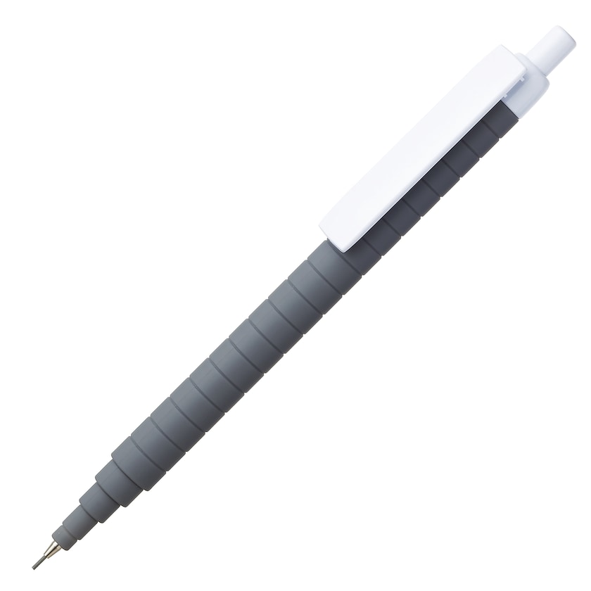 Unikt designet trykkblyant med gummiert pennekropp. Rillene på pennekroppen gjør at pennen alltid ligger stabilt i hånden. Trykket skjer på pennens klips.