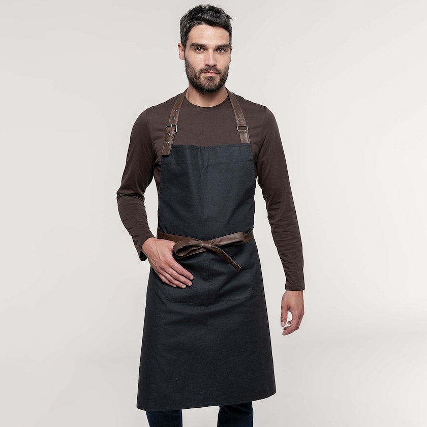 Forkle med vintage-look. Stoffet er spesialbehandlet så det får et lett aldret utseende. Foran finnes en stor lomme med to oppbevaringsrom. Forkleet er 90 cm langt og er 76 cm bredt.