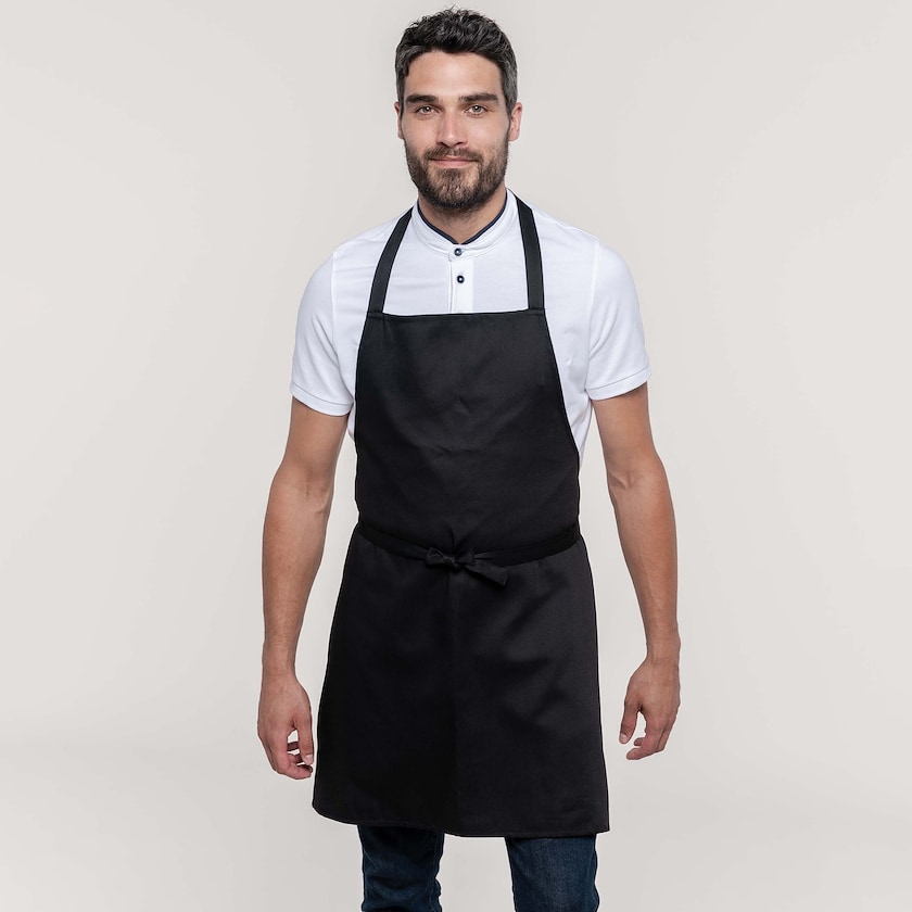 Stilrent forkle uten lommer. Forkleet er laget av et solid stoff av polyester og bomull. Lengden er 77 cm og bredden er 66 cm.