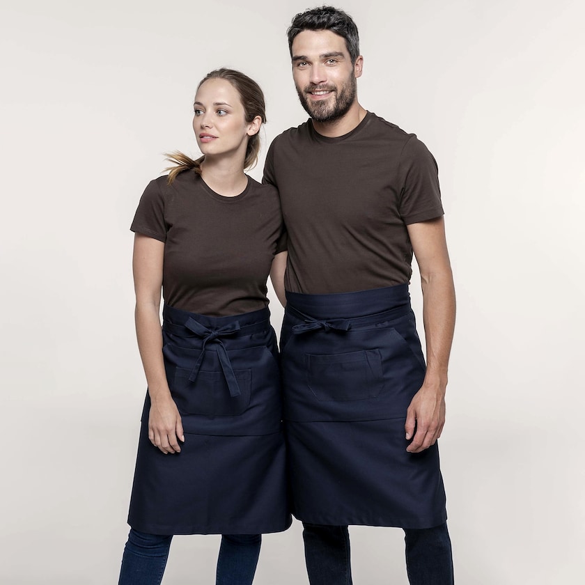 Kort forkle av 100% bomull med to lommer. Forkleet har en lengde på 90 cm og en bredde på 62,5 cm. Finnes i flere fine farger.