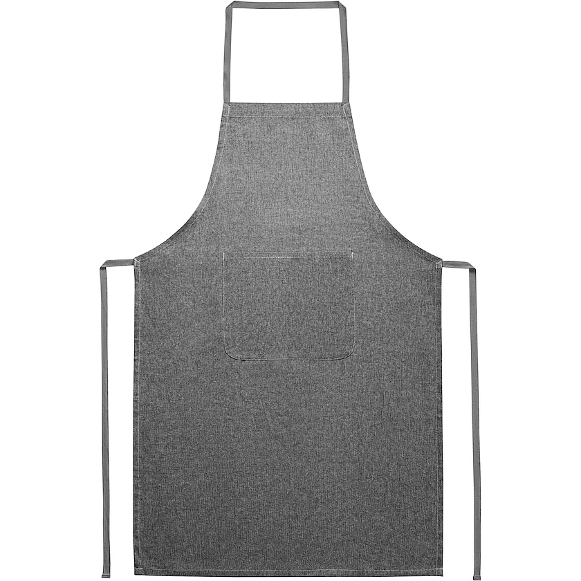 Forkle av resirkulert bomull. Forkledet har en stor lomme på magen. Ettersom stoffet er laget av resirkulert materiale, er stoffet vakkert melert.