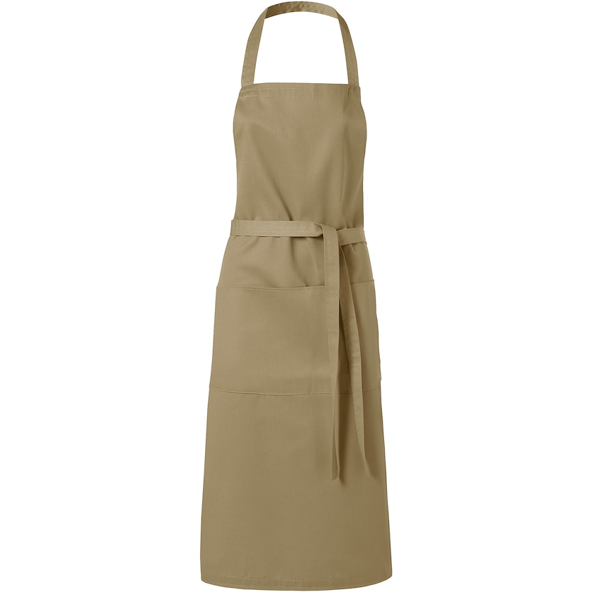 Langt forkle i kraftig twilltøy. Praktisk lomme på magen.