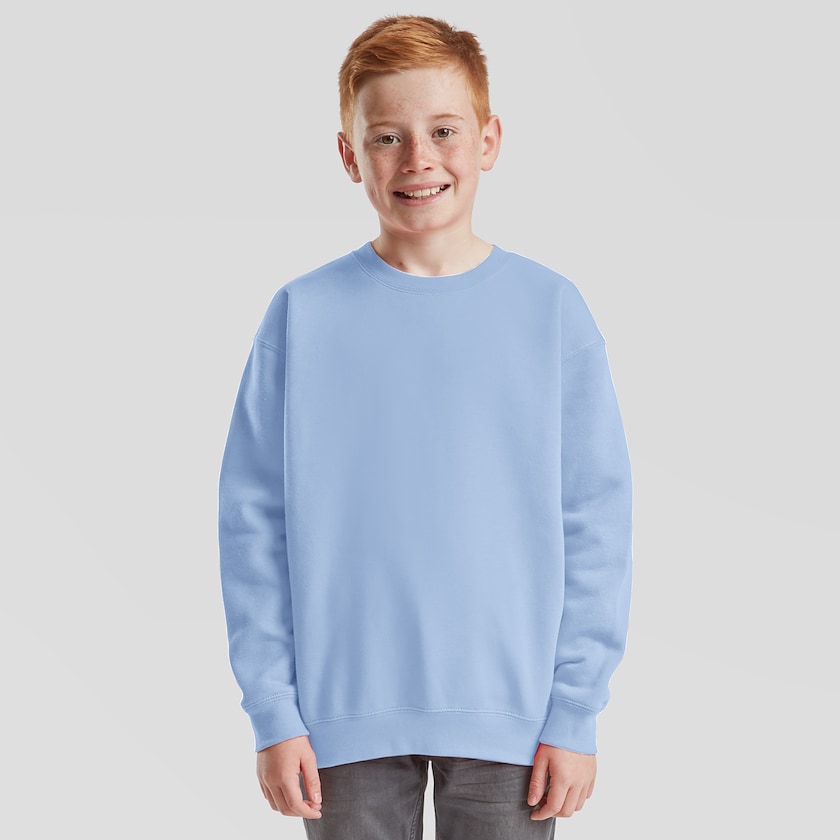 Slitesterk barnesweatshirt fra Fruit of the Loom. En tøff lekekompis! FOTL Kids Premium Set-in Sweat har en noe høyere polyesterblanding enn vanlige FOTL Kids Classic Set-in Sweat. Den er dermed tøffere og orker flere vask enn normalt. Leveres individuelt pakket i plastpose. Finnes også som voksenmodell.