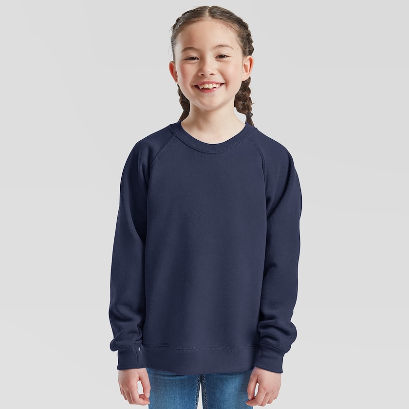 Enormt rimelig sweatshirt for barn. Trøyen er av Raglanmodell, som innebærer at armen er festet oppe i halsen. Dette er en noe mer ledig enn Set-in Sweat. Trøyen finnes i et stort antall farger. Leveres individuelt pakket i plastpose. Finnes også som voksenmodell.
