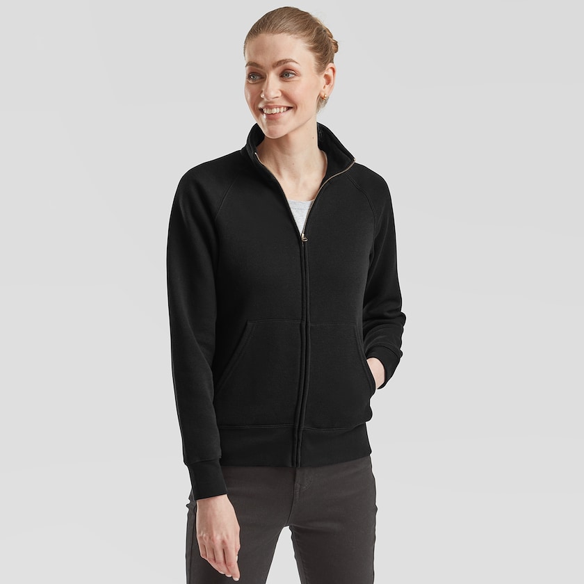 Figursydd genser med høy krage og lang glidelås Lady-Fit Premium Sweat Jacket, har en noe høyere polyesterblanding enn hva som er vanlig, som gjør at genseren er mer slitesterk enn normalt. Genserne leveres individuelt pakket i plastpose. Finnes også som herremodell.