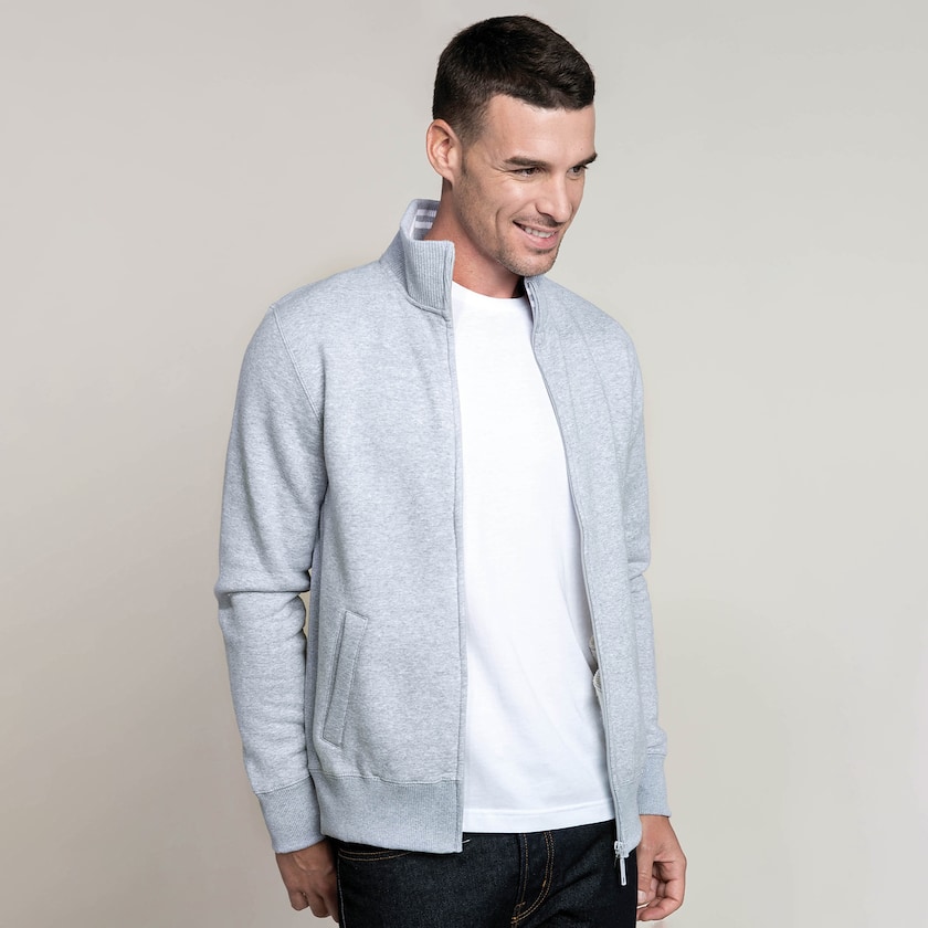 Sporty genser fra Kariban med lang glidelås og kontraststriper i kragen. Genseren er laget av et kraftig, rynkefritt stoff og har to lommer. Leveres individuelt pakket i plastpose. Finnes også som damemodell.