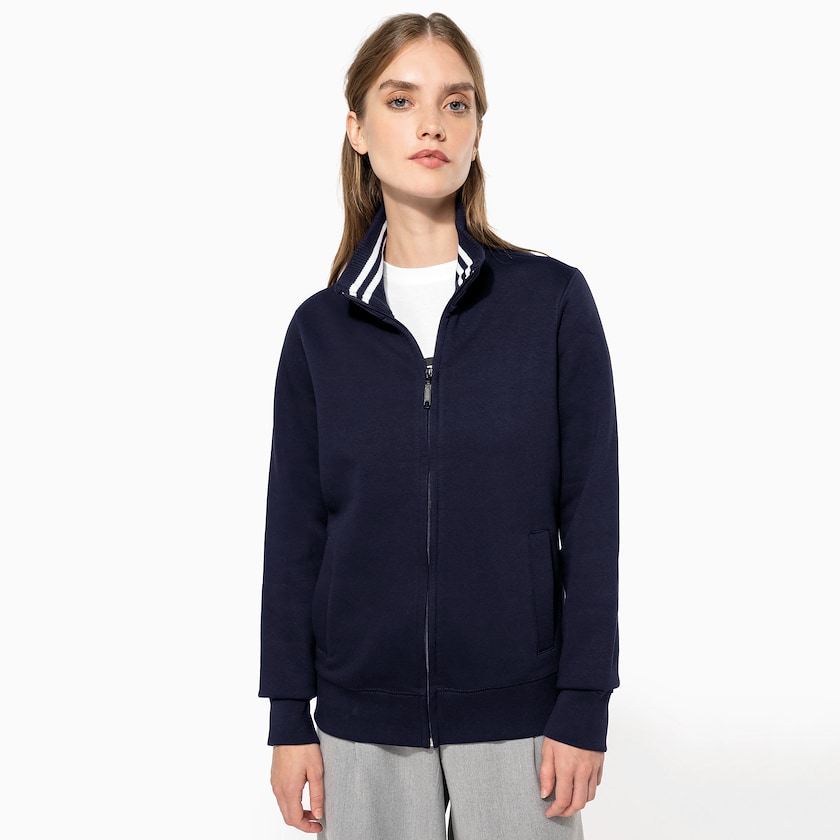 Sporty damegenser fra Kariban med lang glidelås og kontraststriper i kragen Full Zip Women, er laget av et kraftig og rynkefritt stoff og har to lommer. Leveres individuelt pakket i plastpose. Finnes også som herremodell.