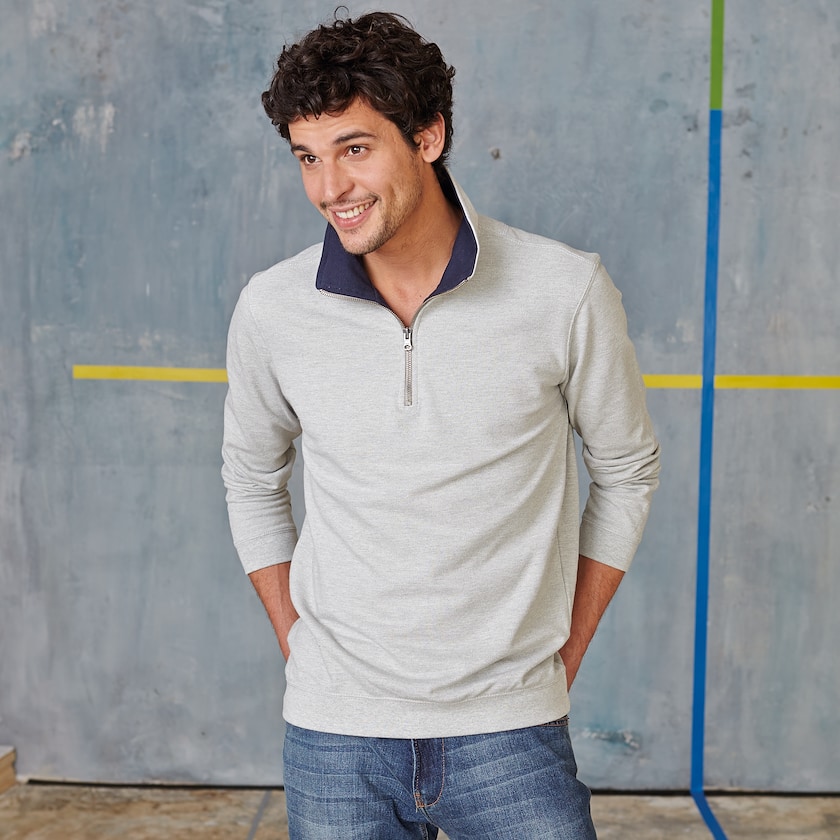 Genser med kort glidelås og innerkrage i kontrastfarge. Kariban Trucker er en løs og ledig trøye som egner seg bra for broderi. Leveres individuelt pakket i plastpose.