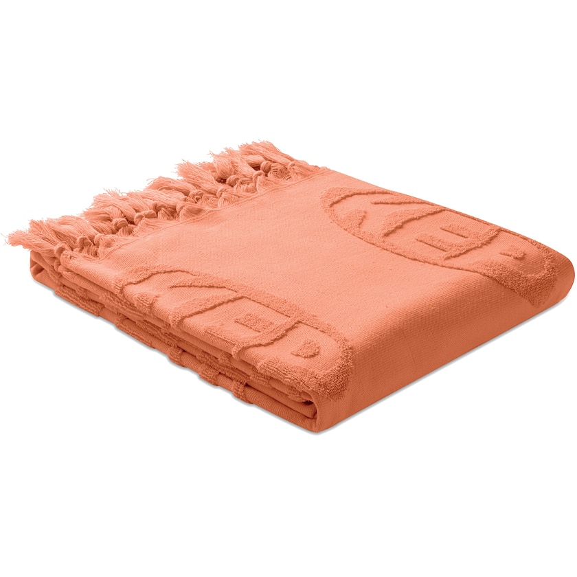 Hamamhåndkle med knyttede frynser og ditt motiv vevd i relieff. Stoffet veier 320 g/m² og er laget av 100% bomull. Du velger selv farge på håndkledet ved å opplyse om ønsket pantonekode. Motivet fremstår opphøyet eller nedsenket avhengig av side. Levert antall kan være +/- 10% fra bestilt antall (levert antall faktureres).