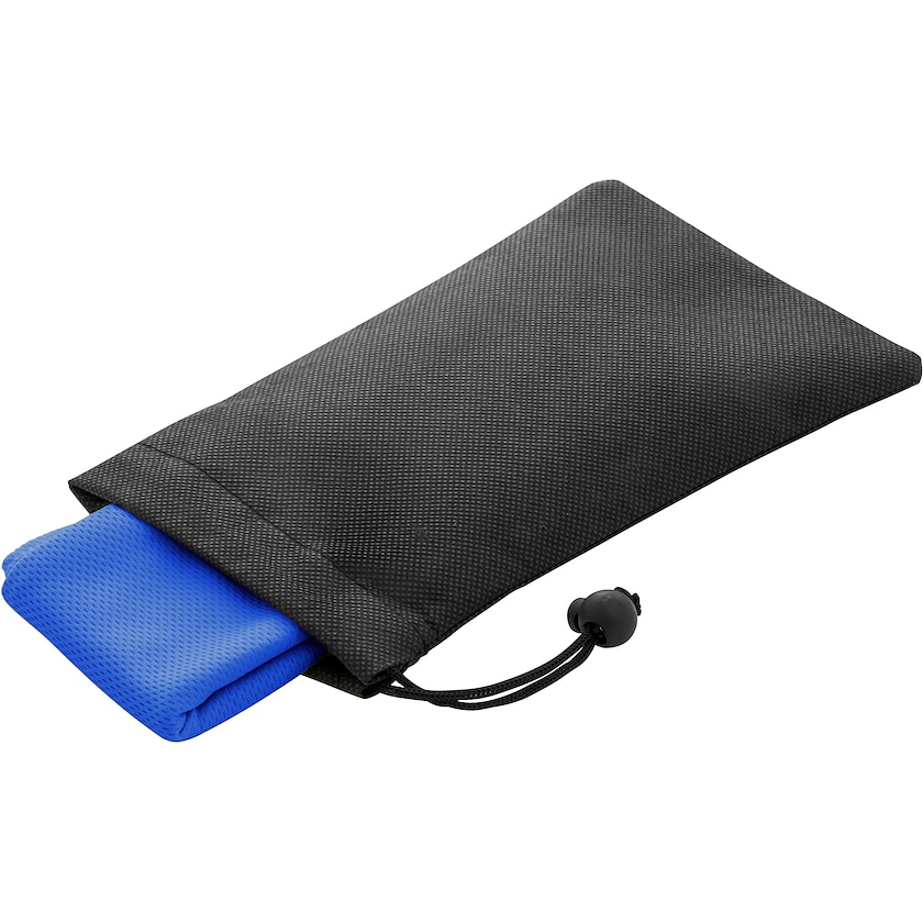 Miljøvennlig sportshåndkle i svart oppbevaringspose. Håndkledet holder seg kjølig selv når det er vått. Håndkledet er laget av RPET, dvs. resirkulerte PET-flasker. Oppbevaringsposen er av non-woven materiale. Trykkoverflaten på håndkledet er 100 x 60 mm og 140 x 80 mm på oppbevaringsposen.