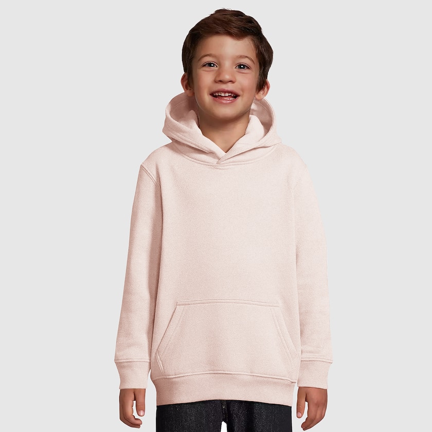 Rimelig hettegenser til barn. Hettegenseren er uten snøring i halsen for å forhindre kvelningsfare. Produsert av 80% bomull og 20% resirkulert polyester.