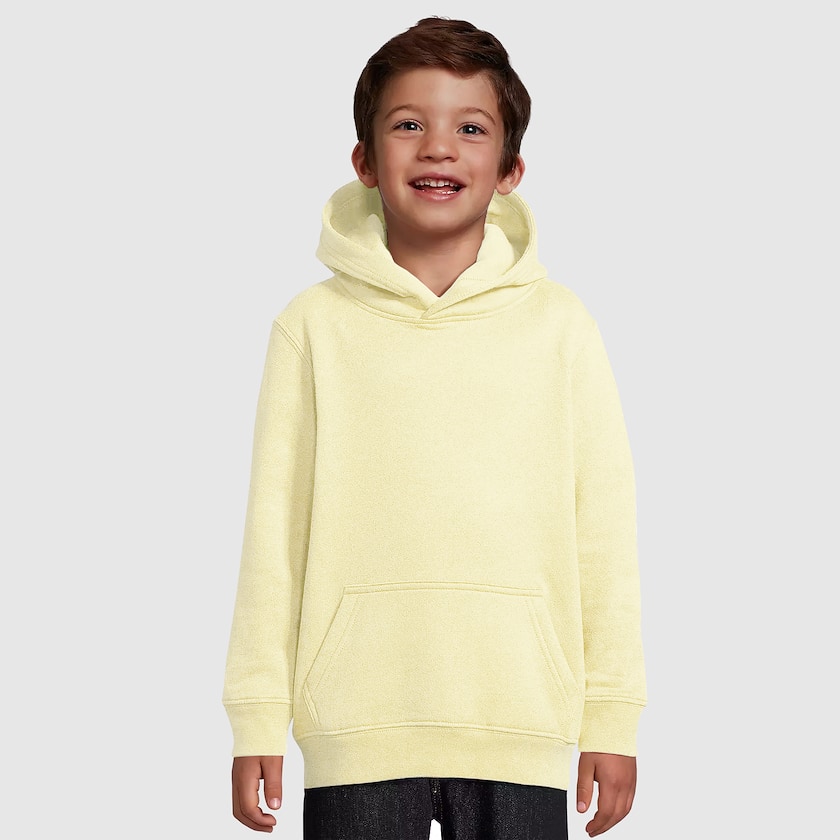Rimelig hettegenser til barn. Hettegenseren er uten snøring i halsen for å forhindre kvelningsfare. Produsert av 80% bomull og 20% resirkulert polyester.