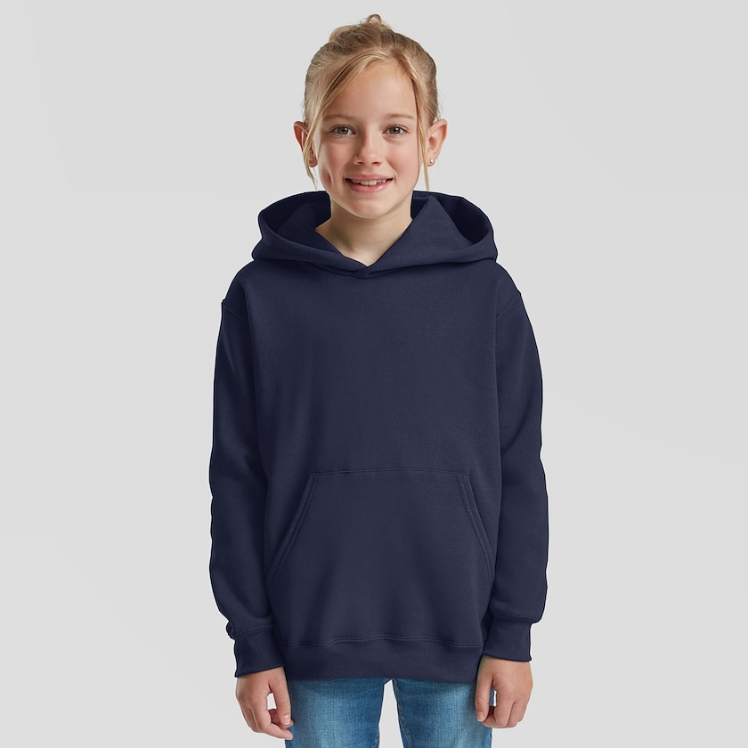 Fruit of the Looms klassiske hettegenser i barnestørrelser. Genserne mangler snøre i halsen for å minimere risikoen for kvelningsulykker. Leveres individuelt pakket i plastpose.