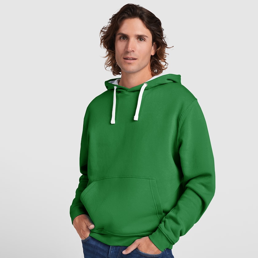 Rimelig hettegenser med trykk fra Roly. Hettegenseren har dobbelt stoff, forsterkede skjulte sømmer i kragen og den klassiske lommen på magen. Stoffet veier 280 g/m2, og er laget av 50% bomull og 50% polyester. Størrelsene er relativt små, så ta gjerne en størrelse større i tilfelle du vanligvis er mellom to størrelser. Finnes også som damemodell.