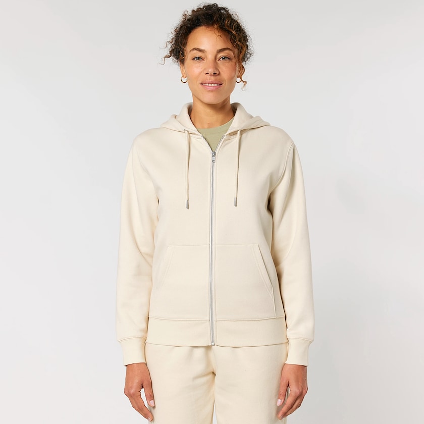 Miljøvennlig hettegenser med lang glidelås til både til herre og dame. Hettegenseren er laget av 100% økologisk bomull.
