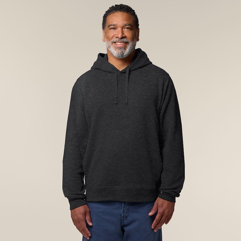 Hettegenser av solid bomull- og polyestermiks. Stoffet veier 280 g per m² og er laget av 85% økologisk bomull og 15% resirkulert polyester.
