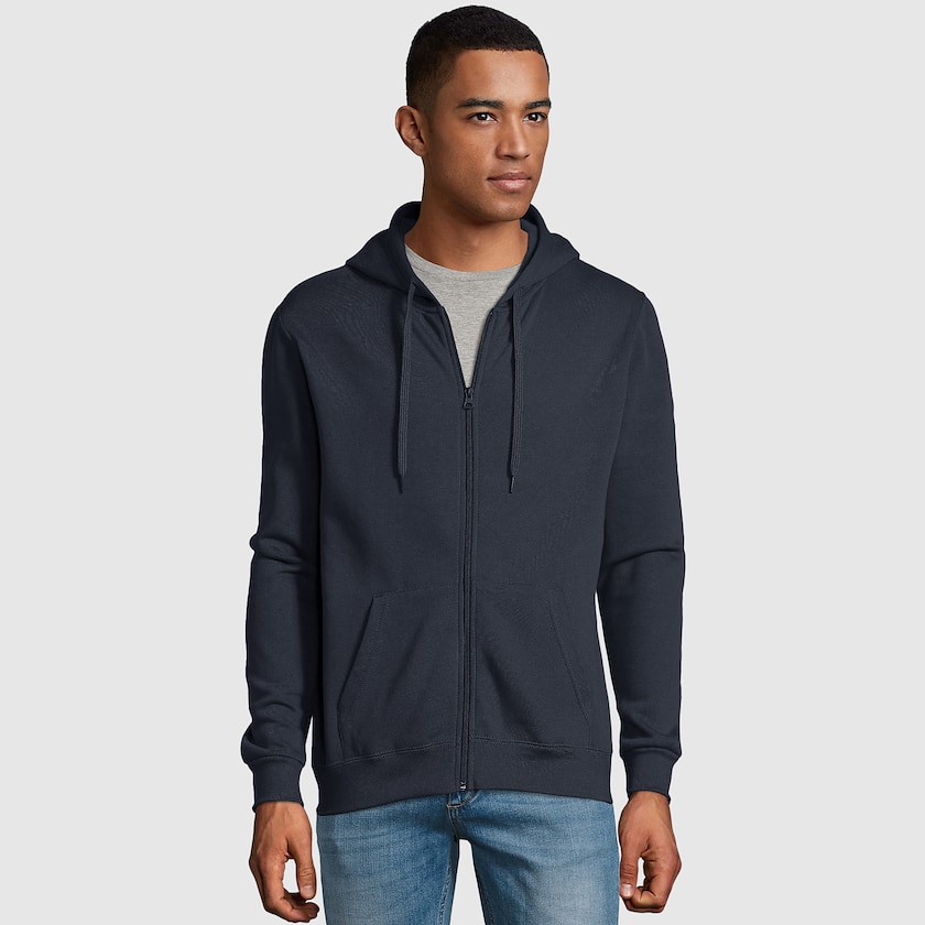Hettegenser med trykk i unisex-modell med lang glidelås. Genseren er en unisex-modell, og er produsert i 260 grams stoff av 50% bomull og 50% polyester. Kan bestilles fra bare 5 stk.