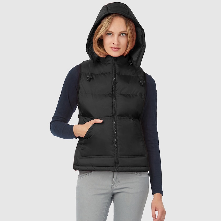 Feminin dunvest for damer fra B&C. Dunvesten har to frontlommer og har en avtakbar hette med glidelås. Dunvesten kan både trykkes og broderes på. yttermaterialet er laget av nylon og foret i polyester.