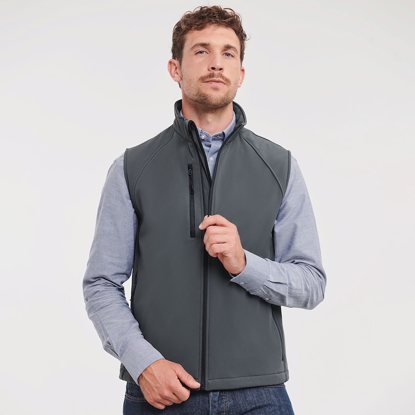 Tettsittende 3-lags softshellvest til herre. Stoffet tåler effektivt både vann og vind og har dessuten pustende egenskaper. Vesten består av tre lag.