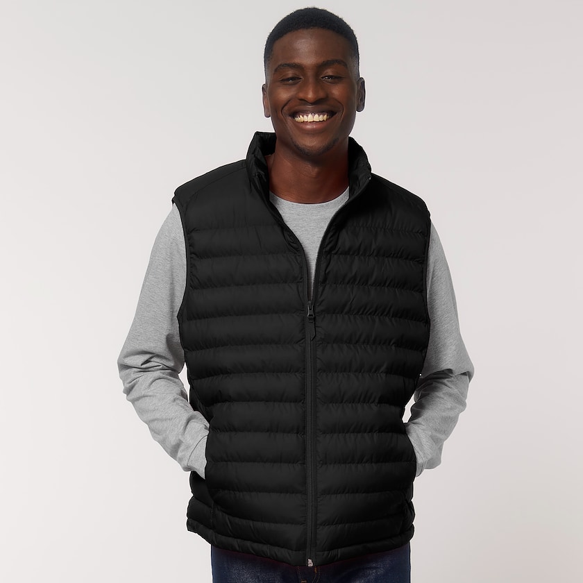 Vest av resirkulert polyester. Vesten har høy krage og sidelommer med glidelås. Broderiprisen gjenspeiler et lite broderi på brystet. Finnes også som damemodell.