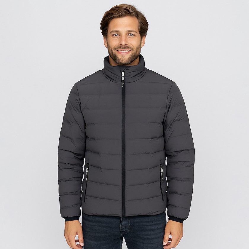 Vinterjakke med dunfôr av resirkulert materiale. En herlig varm herrejakke til kalde vinterdager. Lommene har glidelås. Fôret er av 90% resirkulert dun og 10% resirkulerte fjær. Finnes også som damemodell.